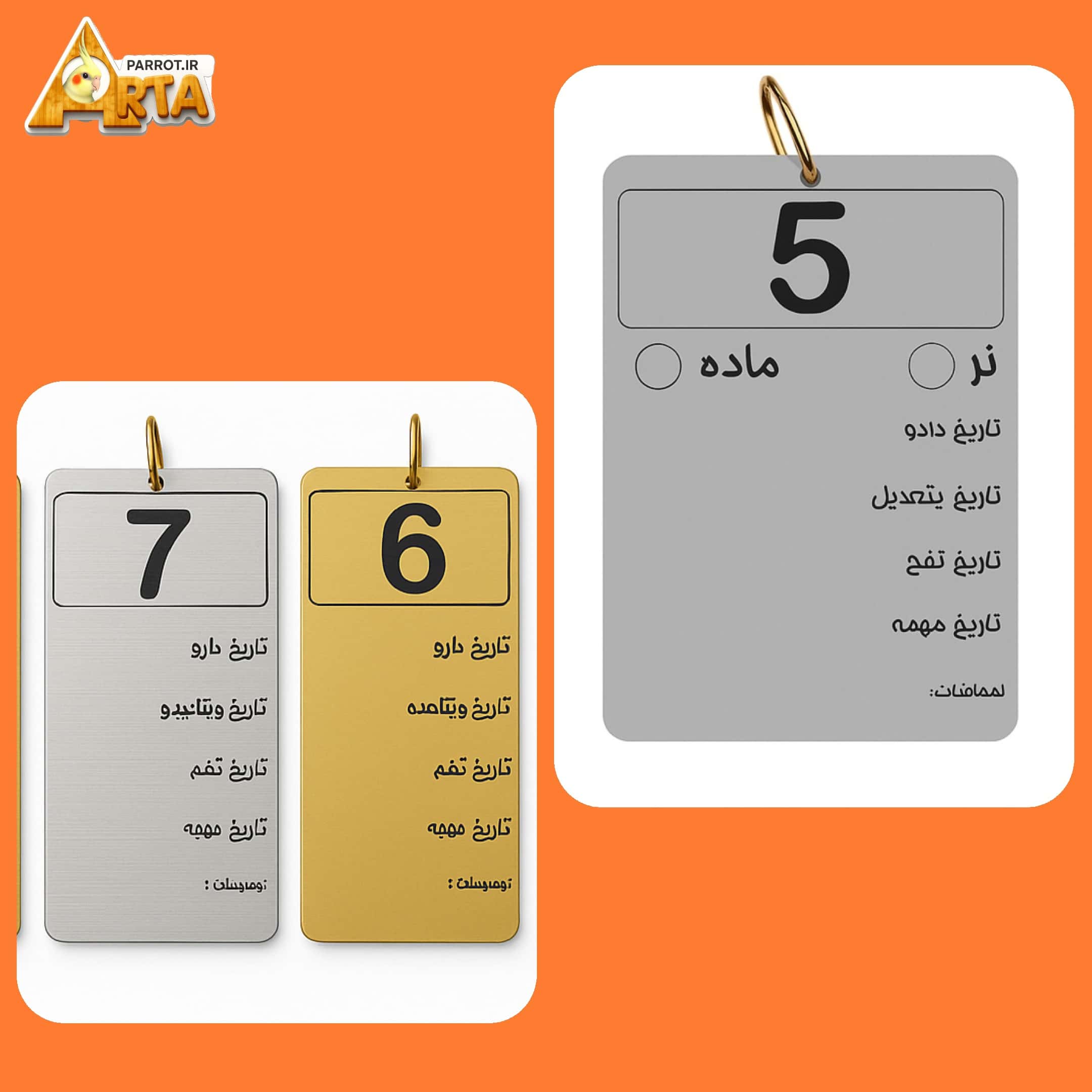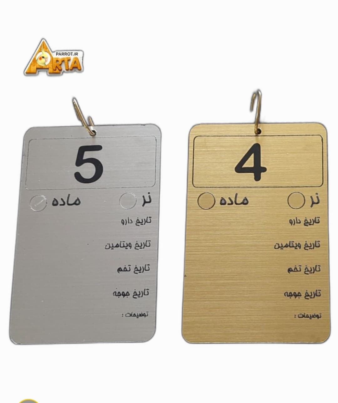 پلاک های قفس پرندگان با اطلاعات ضروری که در سطح پلاک هک شده میباشد محصول در دورنگ سطح طلایی و نقره ای میباشند ، و هر پلاک دارای یک حلقه فلزی محکم میباشد همراه محصول ارسال میشود، جنس پلاک پلاستیک مولتی با روکش درجه بک خارجی طلایی و نقره ای است و در اینجنس امکان نوشتن سطح پلاک با هر ماژیکی میباشد( وایت برد و ساده)